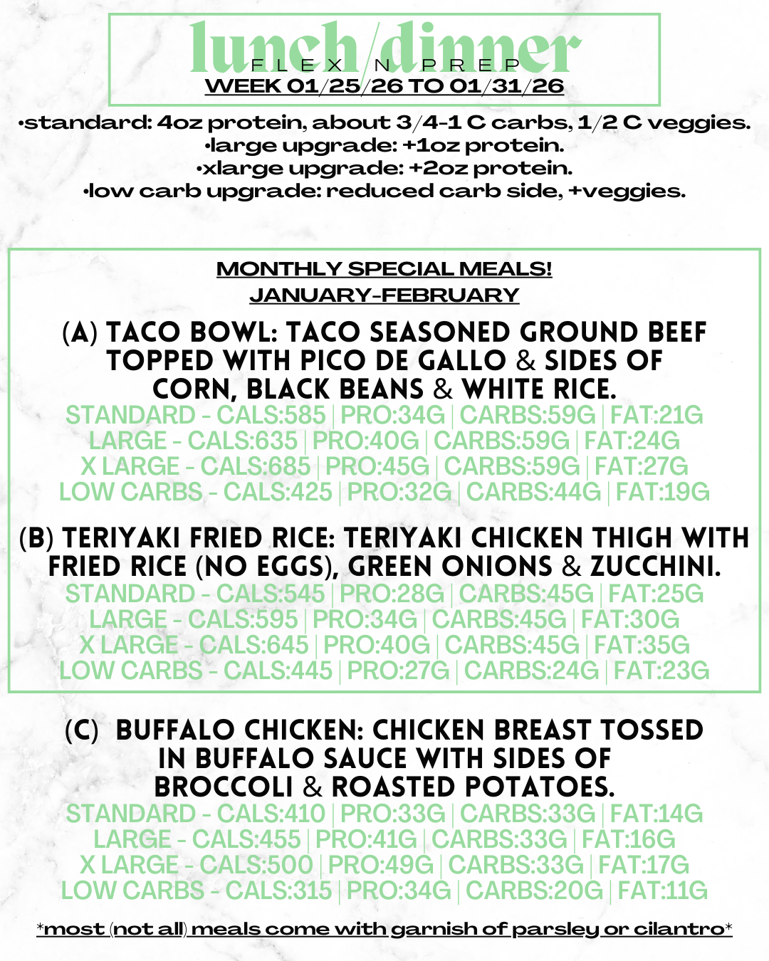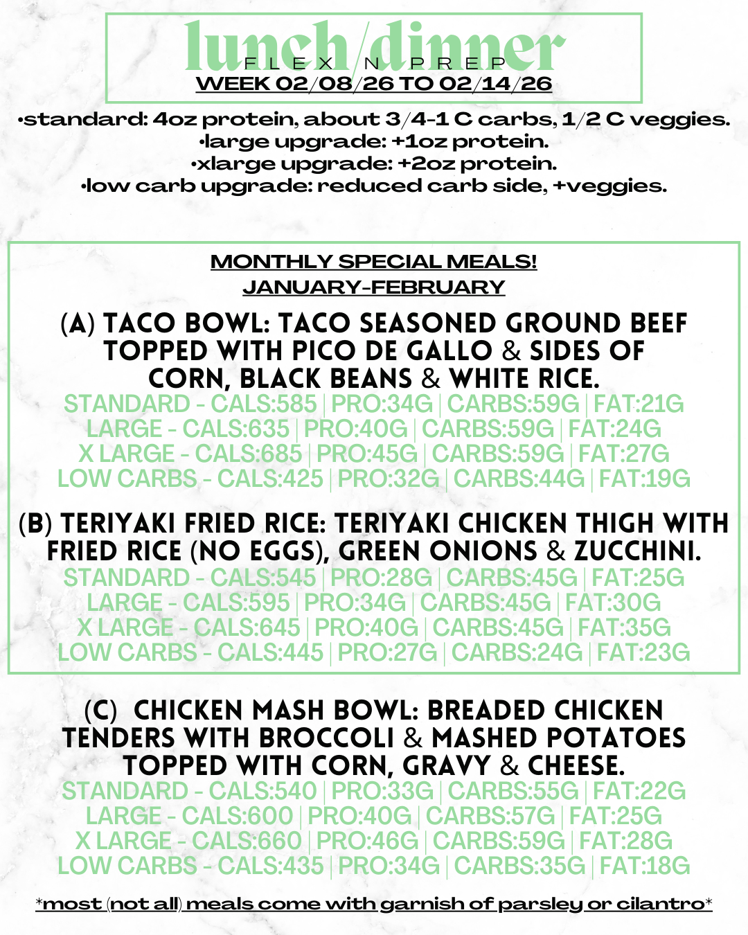 Got Gainz? Level up any meal to our Large (5oz protein) or XL (6oz protein) options!