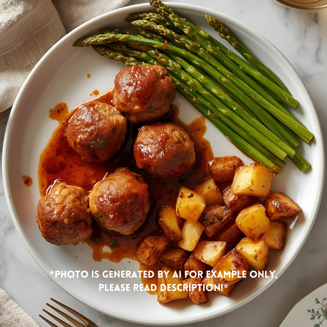 Meatballs tossed in BBQ sauce with sides of asparagus & roasted potatoes.