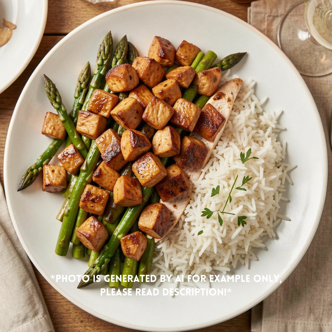Chicken breast tossed in bourbon sauce with sides of asparagus & white rice.