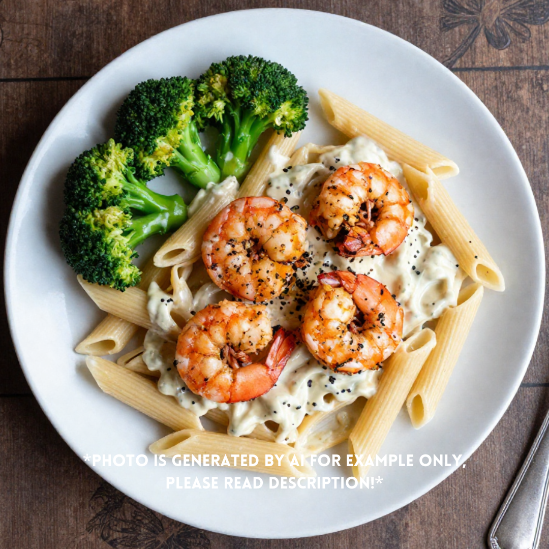 Penne pasta with creamy cajun sauce, cajun seasoned shrimp & side of broccoli.
