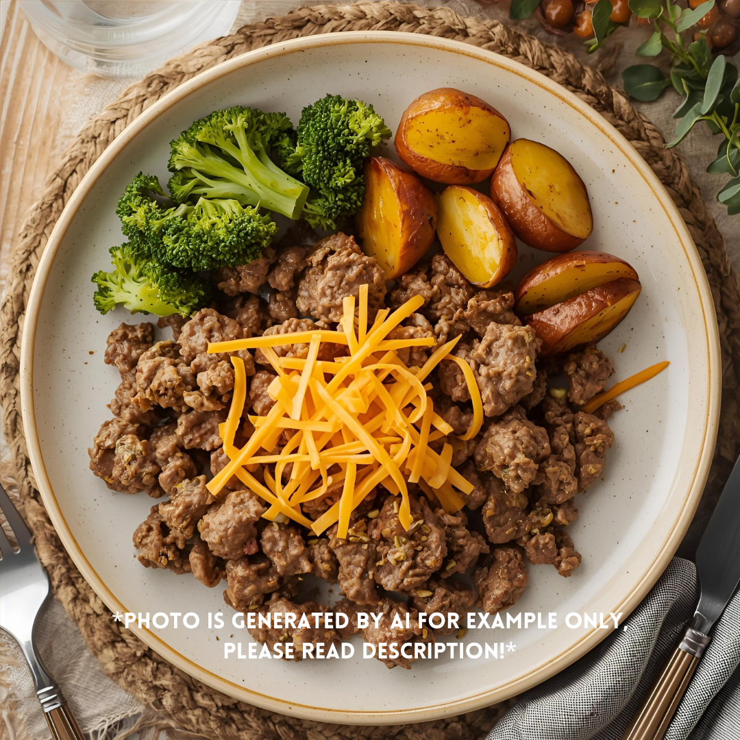 Ground beef with burger seasoning topped with shredded cheddar cheese with sides of broccoli & roasted potatoes.