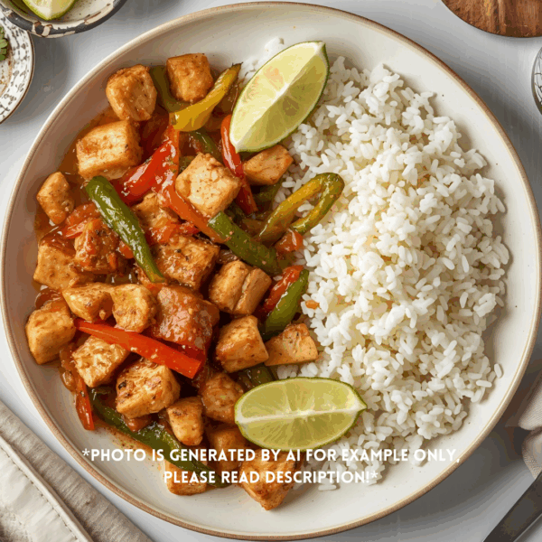 Chicken breast with sauteed bell peppers & onions, white rice & a wedge of lime.