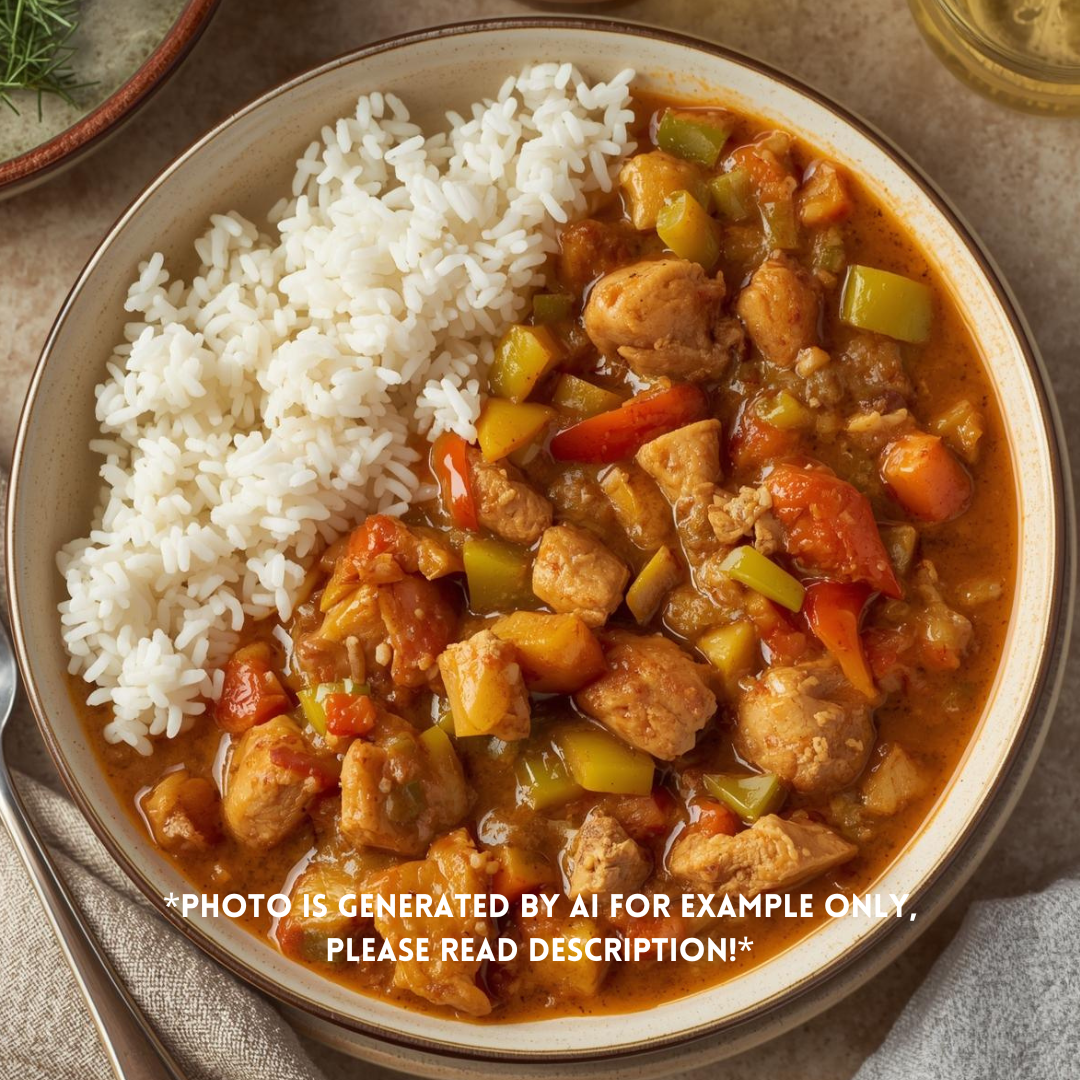 Chicken breast gumbo with bell peppers, celery & white rice.