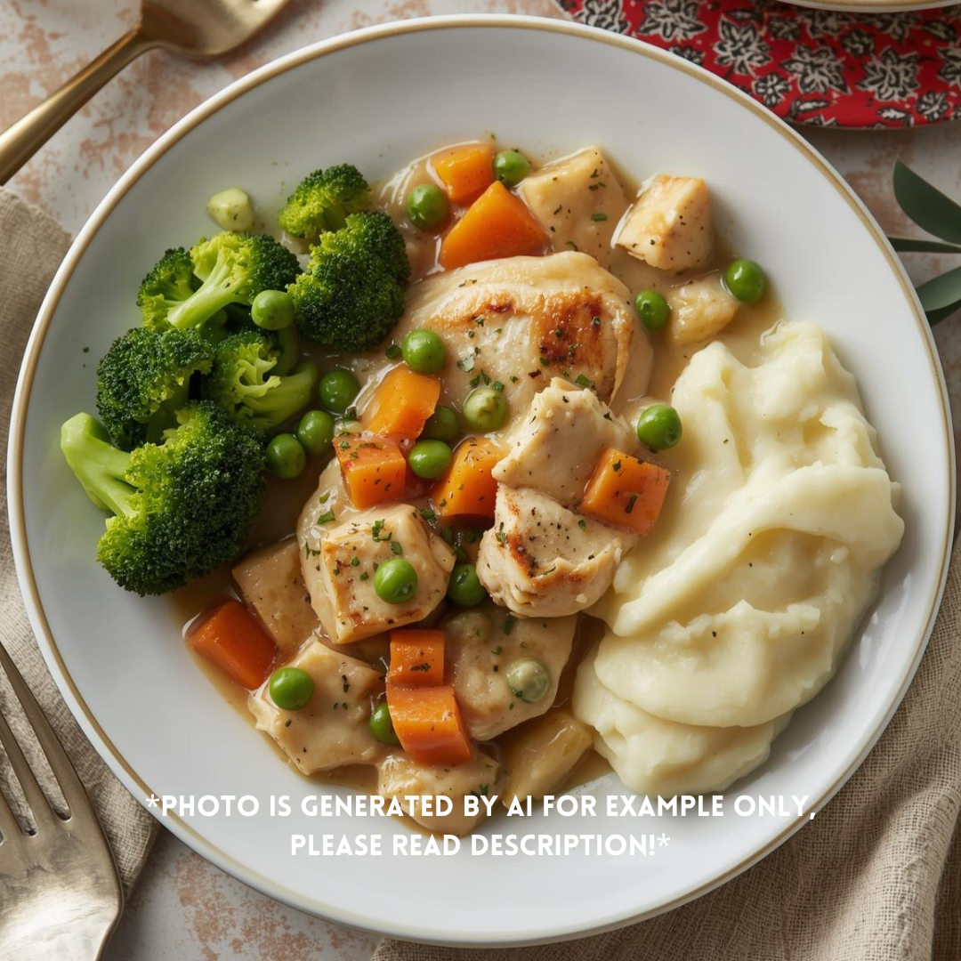 Chicken breast covered in pot pie sauce with carrots & peas & sides of broccoli & creamy mashed potatoes.