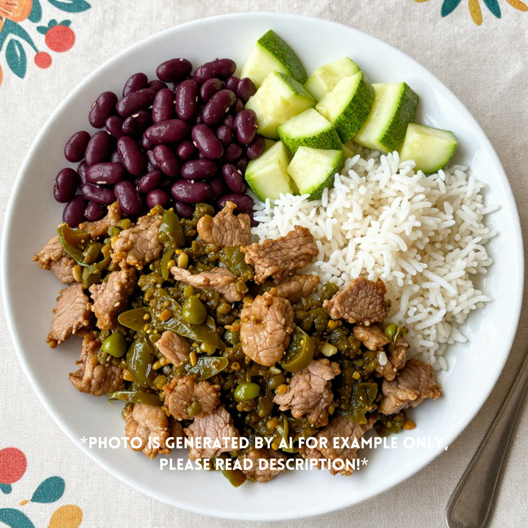 Pork chile verde with sides of pinto beans, zucchini & white rice.