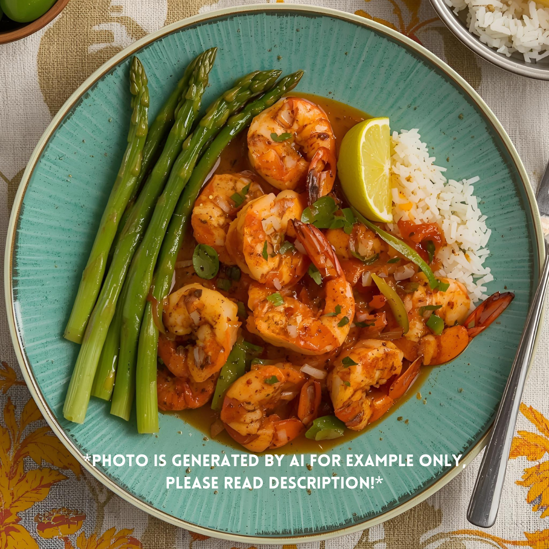Shrimp tossed in fiery lime sauce with sides of asparagus & white rice.