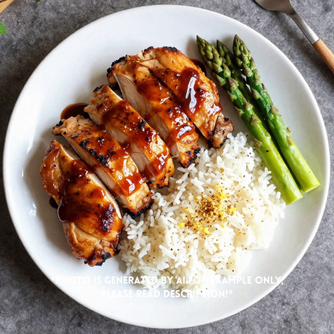 Grilled chicken thigh drizzled with teriyaki sauce & sides of asparagus & garlic white rice.