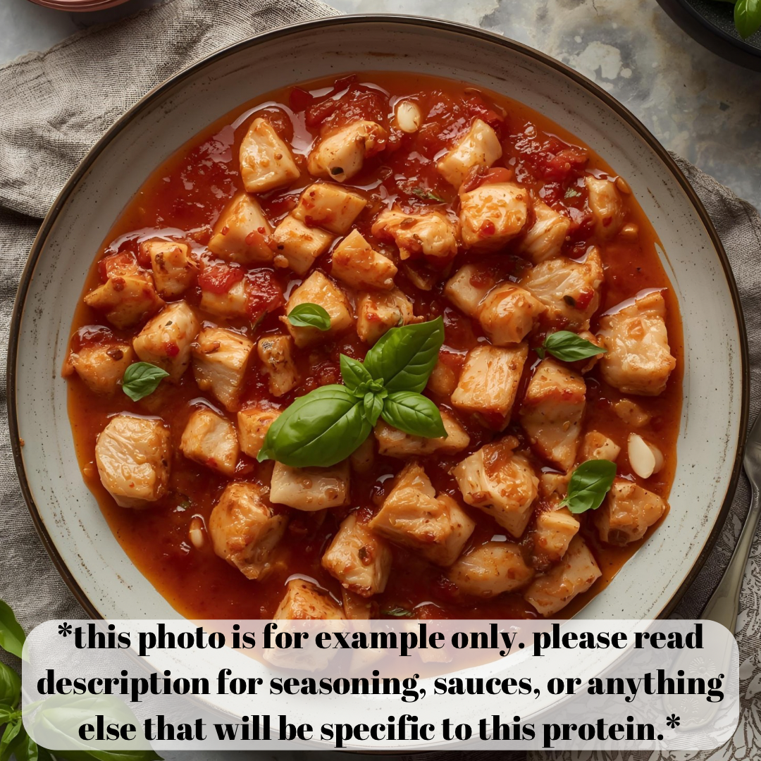 1 LB of cooked & seasoned/marinated Chicken Breast in Tomato Basil Garlic sauce. Sauces can be included in the total pound weight if applicable.