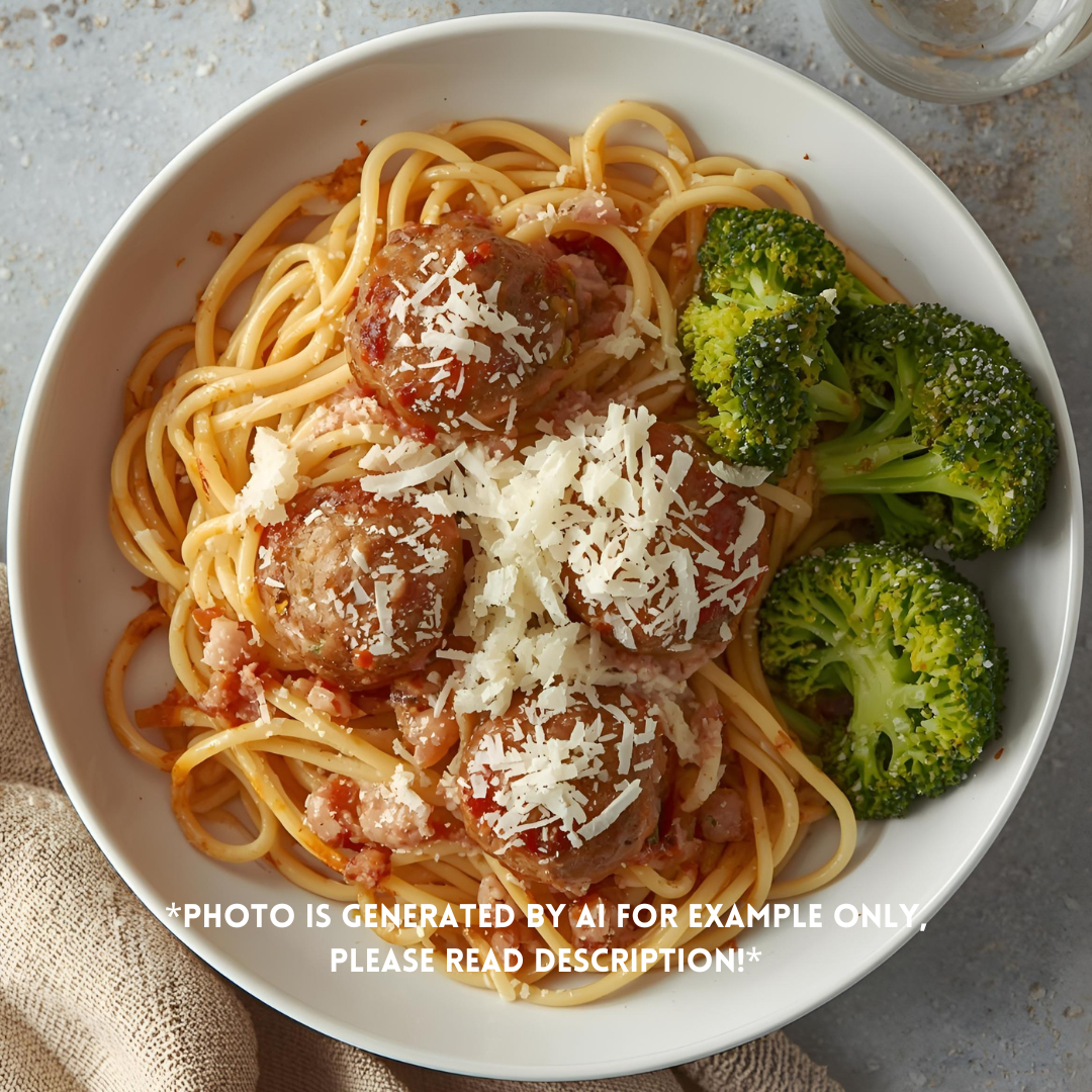 Italian meatballs with spaghetti pasta, marinara sauce topped with shredded parmesan cheese & side of broccoli.