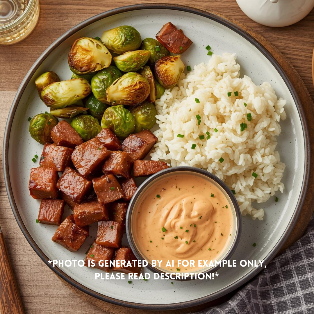 Steak bites with chipotle ailoi dipping sauce with sides of roasted brussels sprouts & white rice.